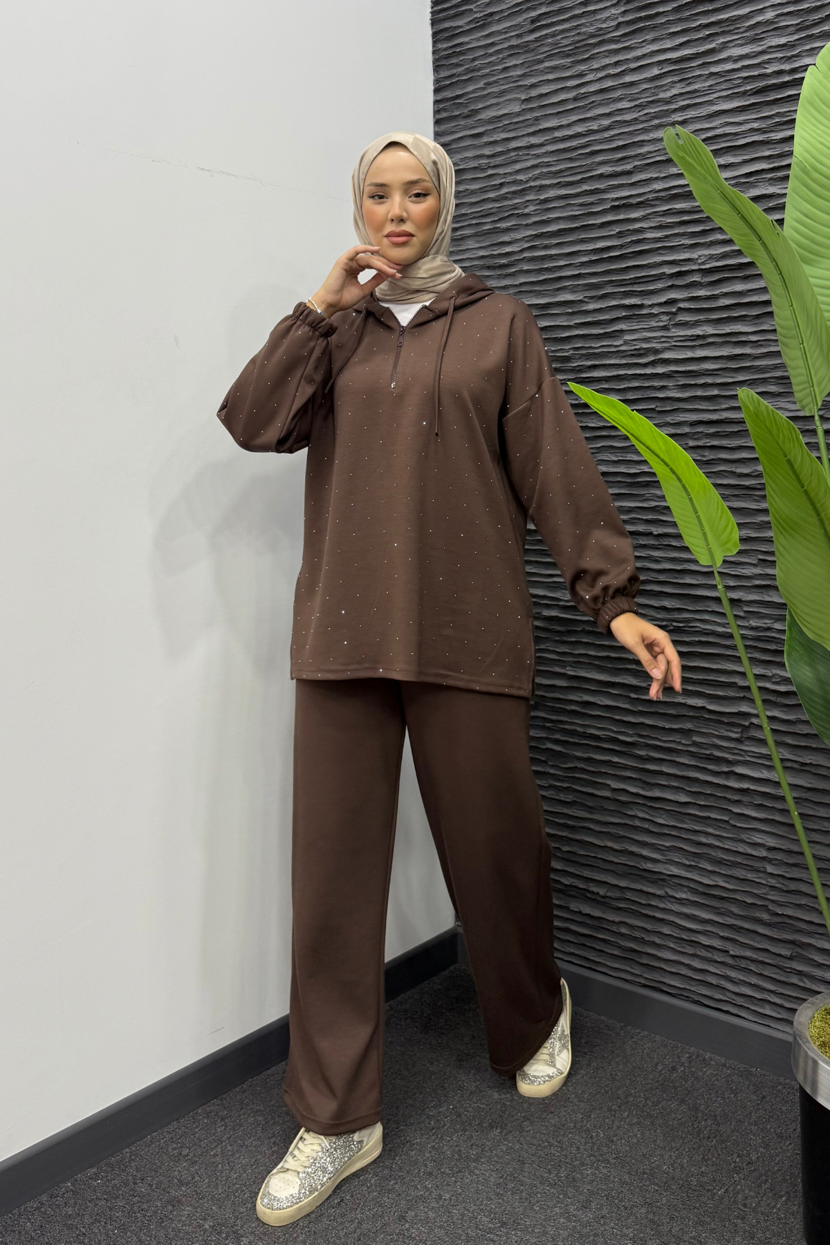 3009 TUNİK TAŞLI FERMUARLI TAKIM-KAHVE