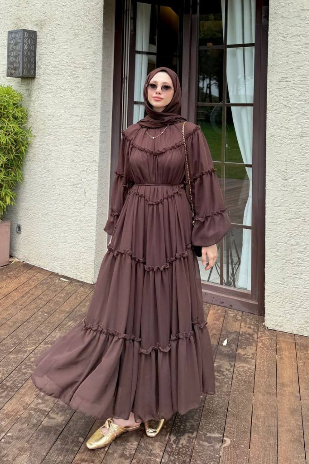 9886 ŞİFON FIRFIRLI ELBİSE-KAHVE