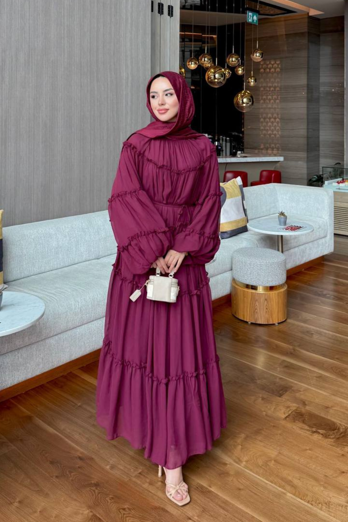 Elbise şifon kumaştan üretilmiştir. Astarlıdır.