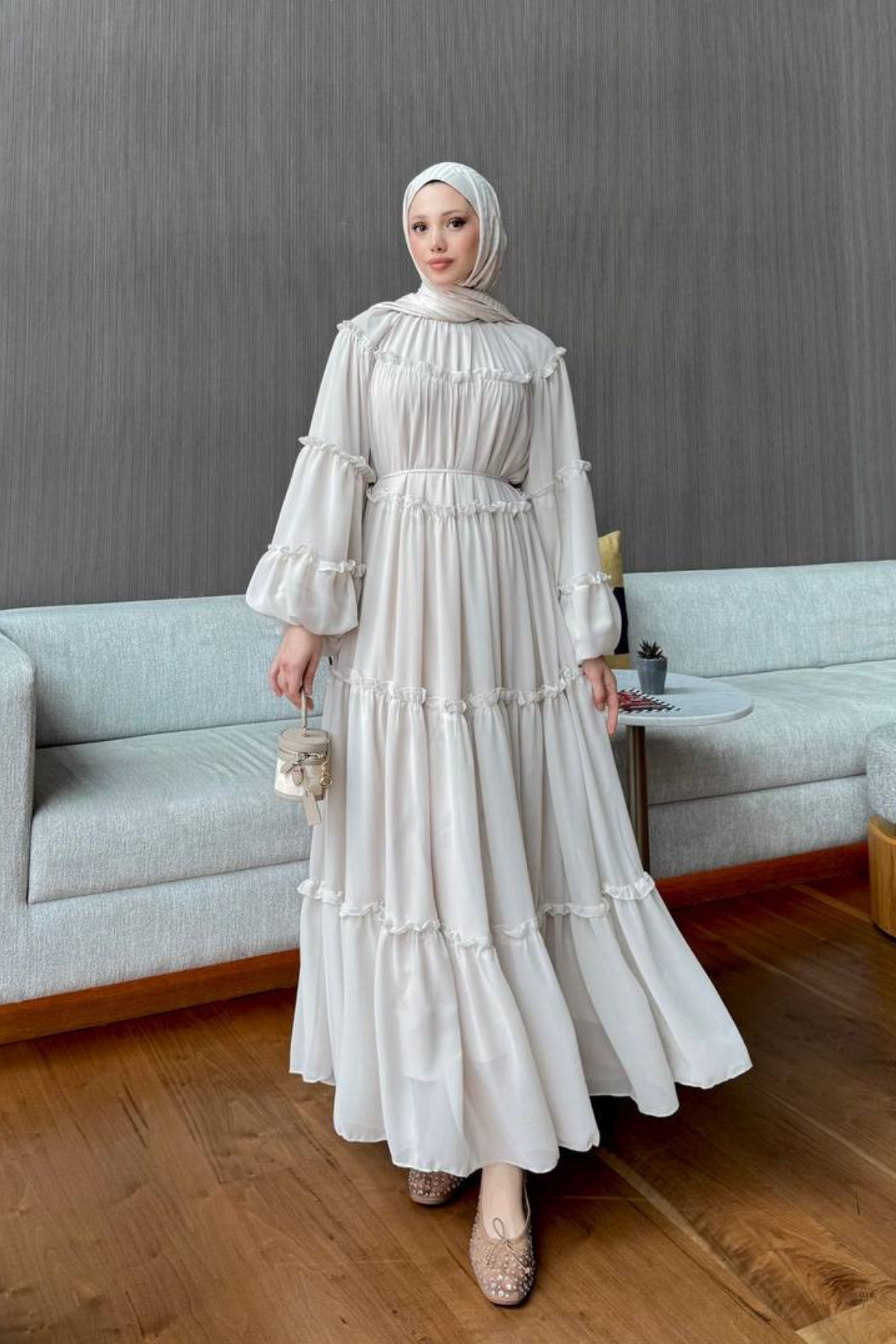 9886 ŞİFON FIRFIRLI ELBİSE-TAŞ